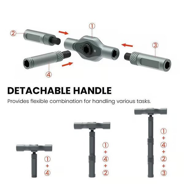 【T-shaped Ratchet Handle】: Features a detachable T-shaped ratchet handle, offering enhanced leverage andcomfort during prolonged use.