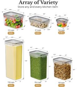 Superior Bundle – Your complete bundle comes with 36 BPA-free premium containers for food. measuring spoon set. a chalkboard marker & bonus reusable chalkboard labels. all in all a complete pantry organizer set.Best Bang for your Buck – We provide a higher total storing capacity unlike most others on Amazon. Includes 6 extra large containers (2.8 liters). 6 large containers (2.0 liters). 6 medium containers (1.4 liter). 6 small containers (0.8 liters). 6 extra small containers (0.52L). 6 mini containers (140ml)Versatile Containers – Upgrade your food storage game by storing anything – flour. sugar. rice. grain. cereals. nuts. beans. snacks. pasta spaghetti. coffee and tea. Not only this. you can also hold other pantry storage items including liquids.Stackable Design – These airtight food storage containers with lids are modular and will stack to minimize space consumption. Easy for storing inside the refrigerator. freezer or cupboard which enables you to get the kitchen organized and frees up space in the pantry.Maximum Airtight Protection – The 4 sided-locking lids with silicone seal ensure that no air or water enters. keeping your favorite snacks super fresh and dry. These canisters are designed to cater to all your kitchen storage needs.