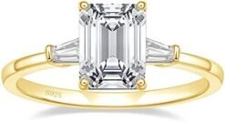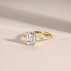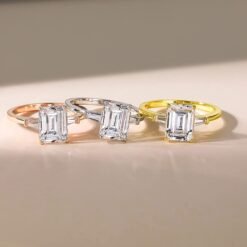 - Stylish Captivating two trapezoid-shaped stones brilliantly frame the center emerald stone in this classic three stone ring. The petite band gently tapers and secures the gems in a basket setting