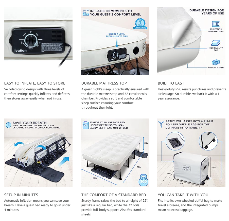 Automatic inflation means you can save your breath. Have a guest bed ready to go in under 4 minutes!
