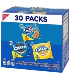 One Nabisco Sweet Treats Cookie Variety Pack with 30 two-cookie snack packs. including 10 each of OREO Original. OREO Golden and CHIPS AHOY (packaging may vary)
