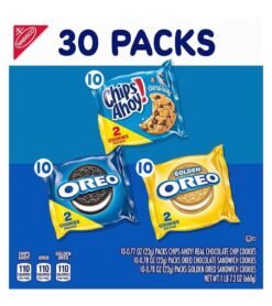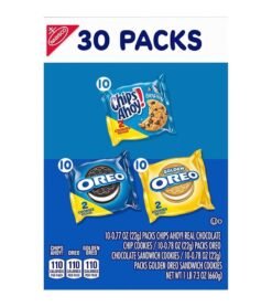 Individual Snack PacksOne Nabisco Sweet Treats Cookie Variety Pack with 30 two-cookie snack packs. including 10 each of OREO Original. OREO Golden and CHIPS AHOY! (packaging may vary) |