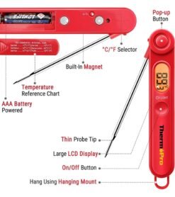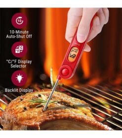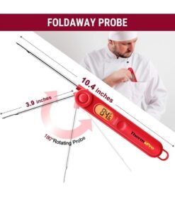 ThermoPro TP-03 is an effective solution to achieve the most accurate temperature in a matter of seconds. The digital kitchen thermometer with a simplistic yet practical design that a push of the button. the foldaway probe will pop open for quick an easy temperature reading. and when you’re done taking the temperature measurement you can fold the probe back in to ensure the probe is kept safe and clean. Don’t sweat powering the food thermometer off as it’s designed to conserve battery power after 10 minutes of no use. The meat thermometer with a backlit LCD display. reading temperatures in your preferred unit of measurement between Celsius or Fahrenheit is a breeze. Stop overcooking or under-cooking your meat and perfect meat temperatures like a professional. ensuring the perfect temp every time you’re grilling or cooking!