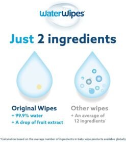 While other wipes have as many as 12 ingredients. WaterWipes Original Wipes are made using only 99.9% purified water and a drop of fruit extract.