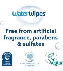 TRUSTED BY DERMATOLOGISTS: Suitable for eczema-prone skin and allergy sufferers. WaterWipes are accepted by the National Eczema Association of America. Dermatologically Approved by the Skin Health Alliance and registered by the Vegan Society.